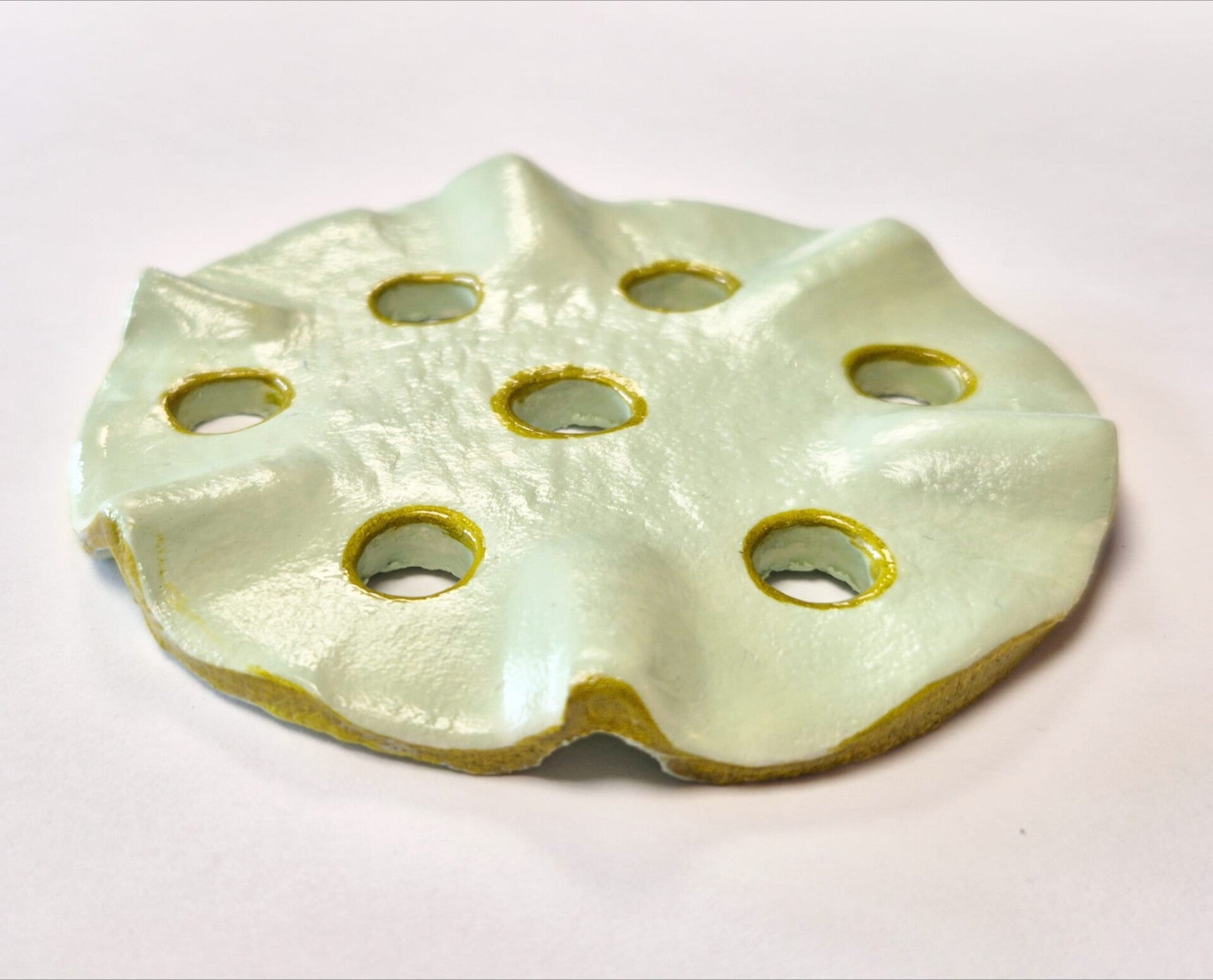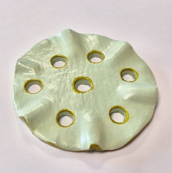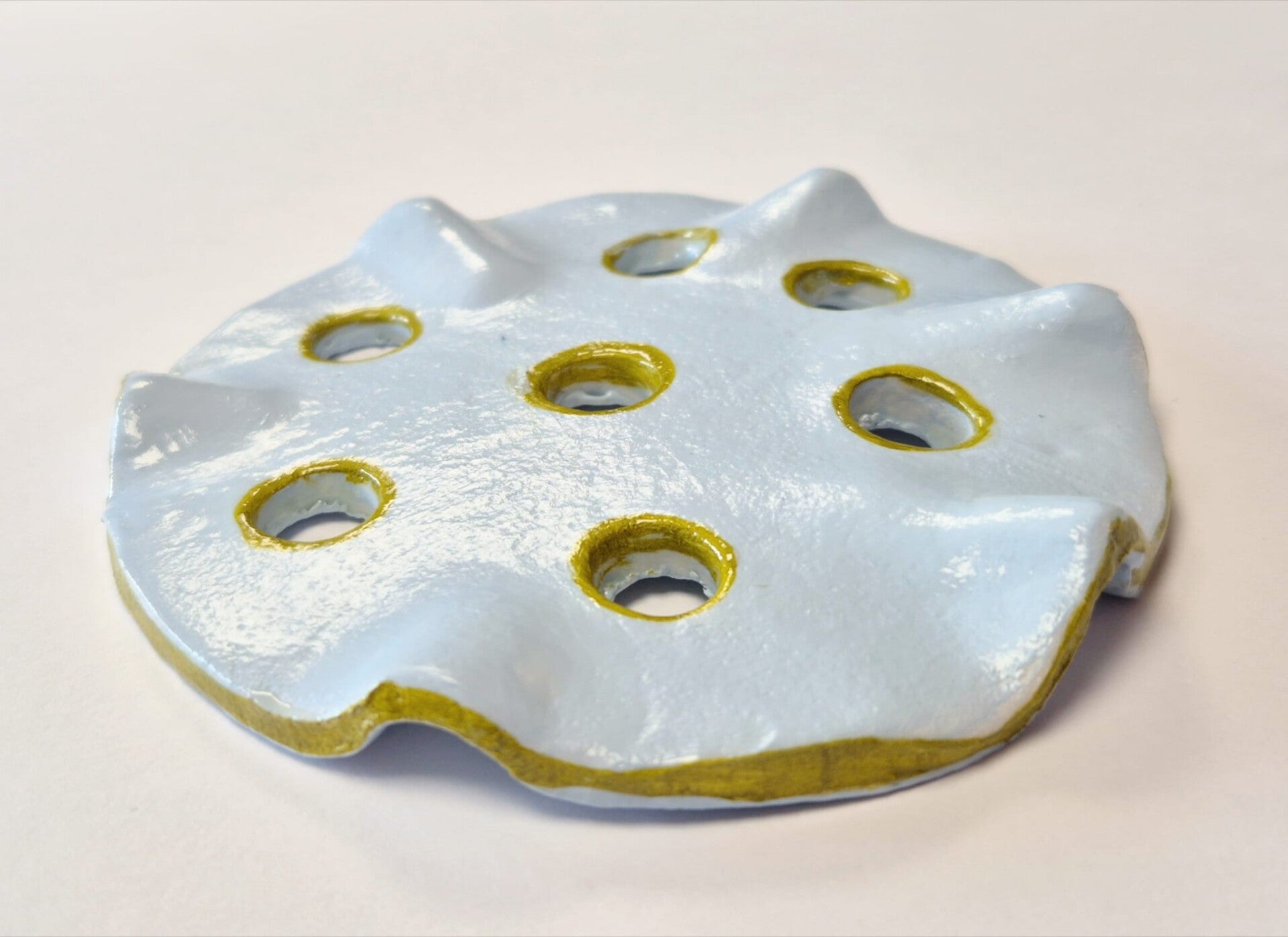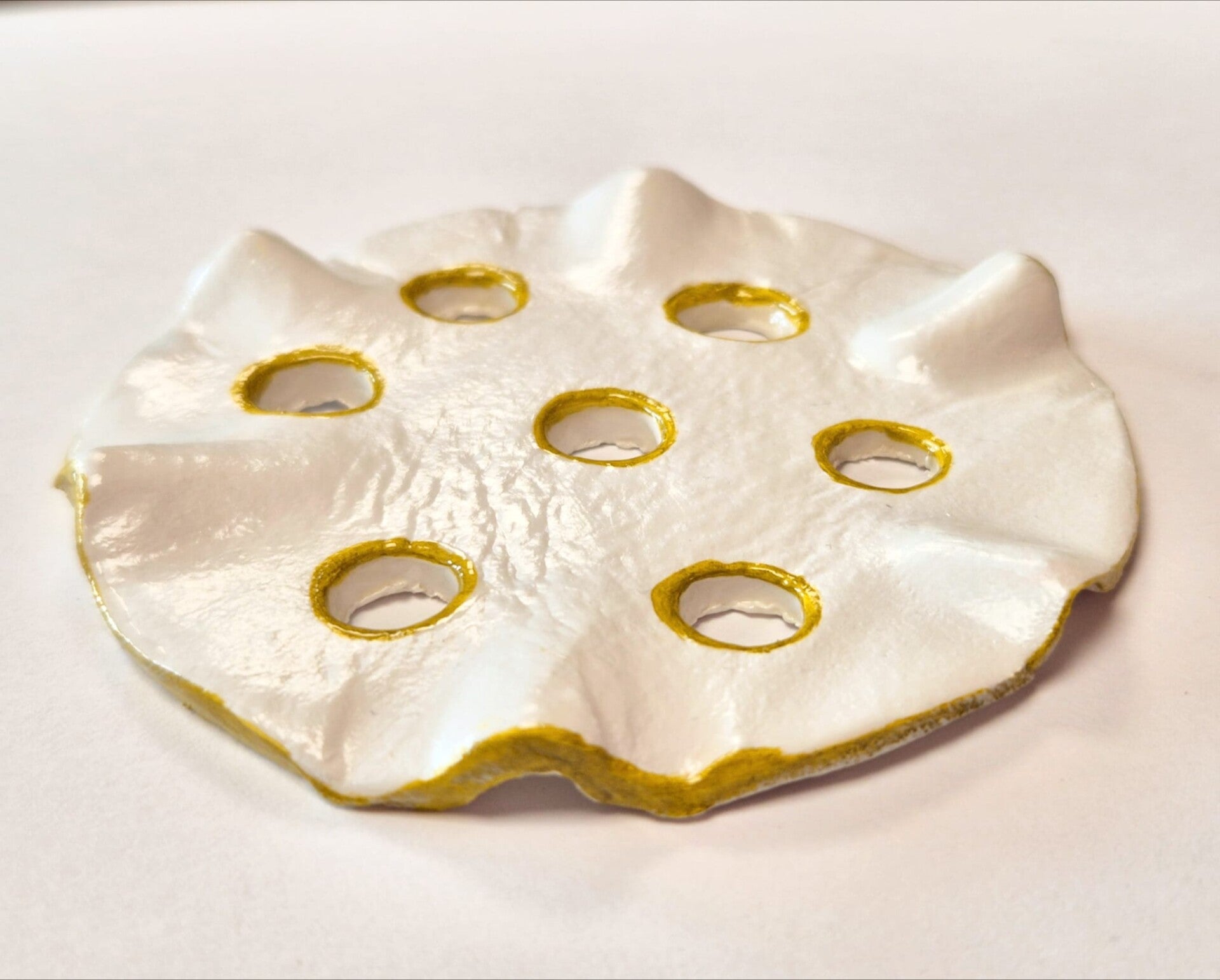 De bloemverdeler is met de hand gevormd van droogklei en afgewerkt met glazuur. De openingen en rand zijn subtiel voorzien van een goudkleurig accent, wat elk stuk een uniek karakter geeft.