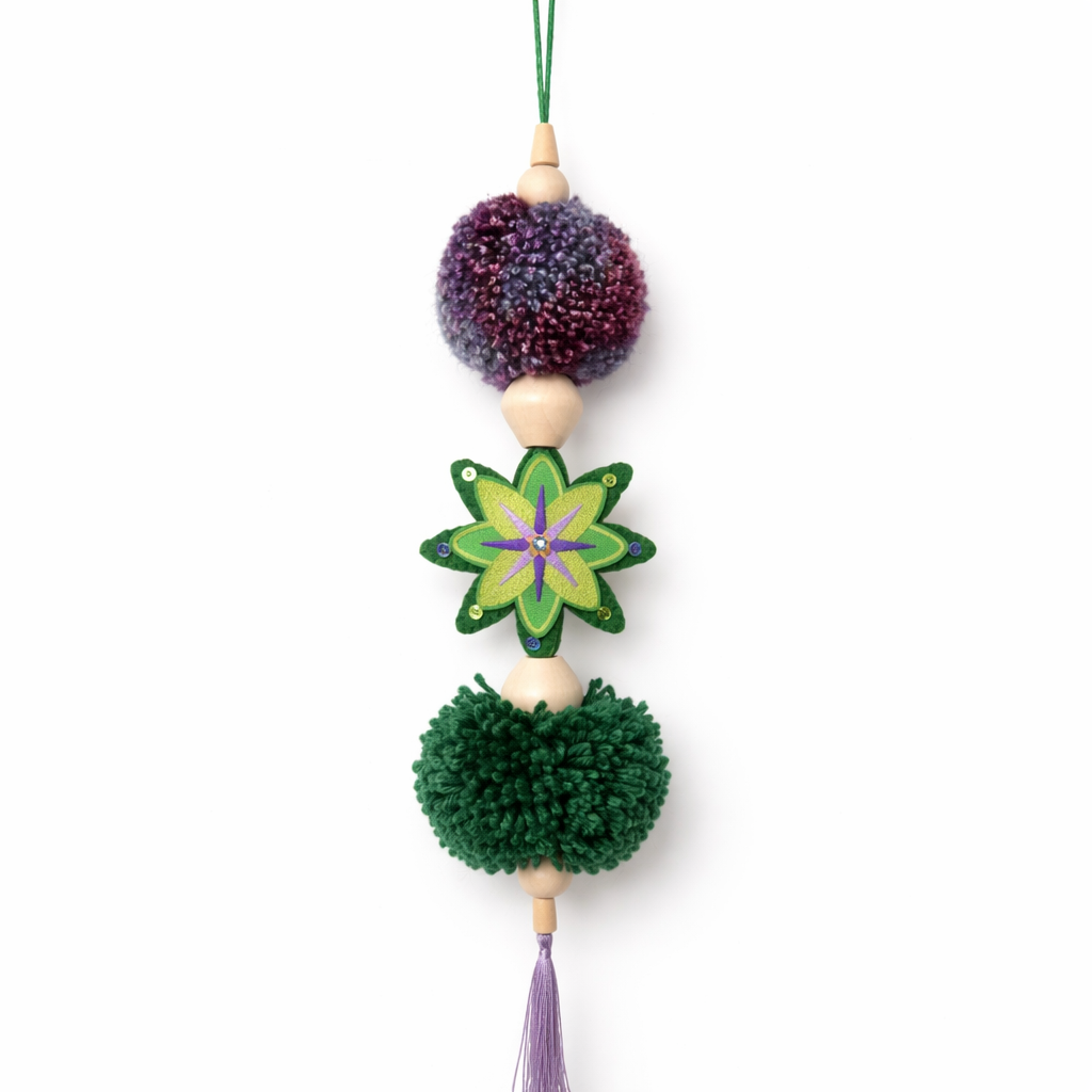 De hanger is opgebouwd uit zachte pompons van wol, houten kralen en een decoratieve bloem van vilt met kleine pailletjes. Door de combinatie van materialen en kleuren krijgt het geheel een speelse boho uitstraling.